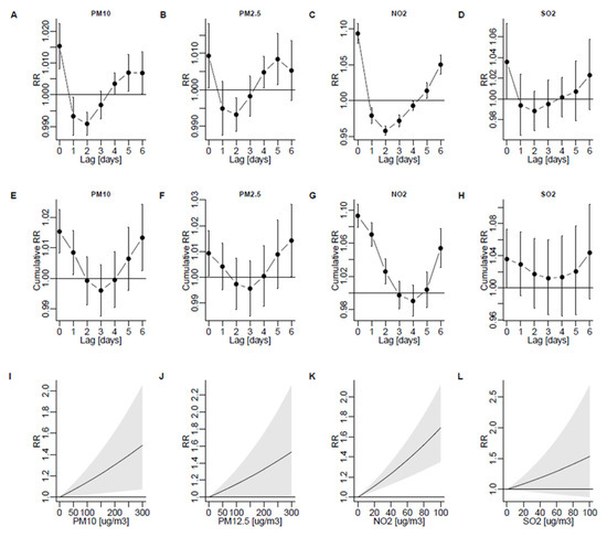 Risk of admission due to J45 or J46 (“asthma”) per 10 μg/m3 for PM10 (A), PM2.5 (B) NO2 (C), and SO2 (D) depending on lag. Cumulative effects are shown in (E–H). Predicted admission risk within a range of exposure is shown in (I–L). 95% confidence intervals are shown as bars (A–F) or shaded areas (G–I). RR, rate ratio.