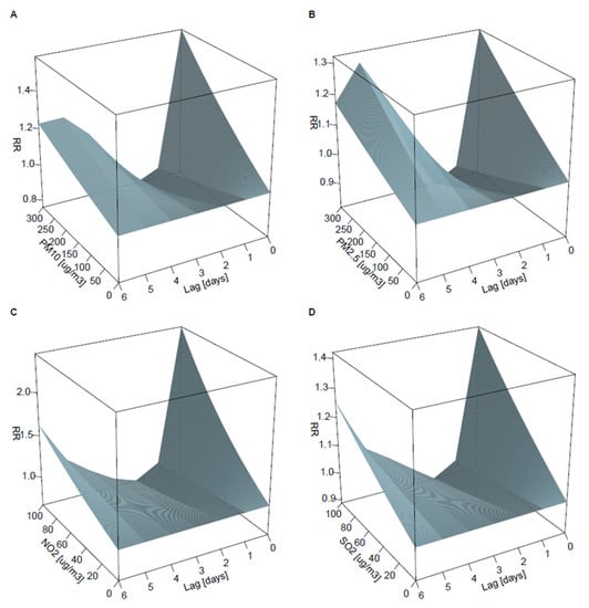 3.2. Lagged Associations between PM10, PM2.5, NO2, and SO2 and the Risk of Admission