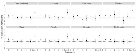 As expected, non-Kuwaiti males exhibited a large relative risk of admissions. Non-Kuwaiti adult males are more vulnerable to higher ambient pollutant exposure given the outdoor nature of many migrant worker jobs such as construction and sanitation []. This is further supported by a previous study conducted in Kuwait on the impact of poor air quality on mortality that reported an increase in non-Kuwaiti male mortality rates associated with exposure to air pollution and dust storms []. This study, however, used visibility, a binary outcome, to describe adverse air quality, whereas in our study we used continuous PM2.5, which is more quantifiable and can provide better regulatory inference and allow for comparison across different studies. Our finding could be influenced by social factors related to access to healthcare, where Kuwaitis can utilize public hospital services for free, whereas non-Kuwaitis must pay a fee to be admitted and/or receive treatment. This likely played a role in potentially underestimating the risk of respiratory hospital admissions among the non-Kuwaiti subgroup. In Thalib and Al-Taiar’s [] paper investigating the impact of dust storms on respiratory hospital admissions in Kuwait, binary measures for exposure were employed (dust storm vs. non-dust storm days) for the period between 1996 to 2000. Our study used continuous PM2.5 measures instead and provided an analysis on hospital admissions using recent data from the past decade.