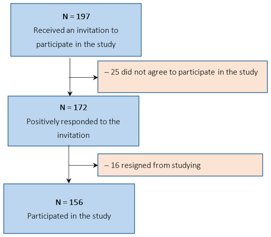 The criterium for inclusion in the study was obtaining promotion to the third semester of study. The respondents gave written, informed consent to participate in the study and were fully informed about the purpose of the study. Initially, 172 cadets fulfilling the study inclusion criteria were enrolled in the study. During the course of the study, 16 cadets dropped out of the study as they opted out of further military service. Ultimately, 156 individuals (19 females and 137 males), i.e., all cadets meeting the inclusion criteria, were included in the study. The study was conducted at the MULF in the period May–July 2021 (Figure 1).