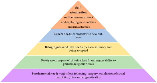 Spirituality is the next important aspect in the second stage of the hierarchy. It is an important dimension of quality of life for a human to succeed in their life. Many had experienced positive changes in their spiritual health following weight loss after surgery. For a Muslim, physical fitness is crucial in performing a prayer, reciting the Quran, performing Hajj, and fasting. Excessive abdominal body fat makes the act of praying difficult due to certain movement limitations. Reciting the Quran becomes more challenging as it requires one to control and manipulate their breath, leaving them breathless even to complete one surah. After the surgery, we found that many participants increased the number of their spiritual activities, which included performing more night prayers, going to the mosque, and reciting the Quran. This is in agreement with a previous study in which the surgery helped restore the physical function of a person by extreme weight reduction [26]. Spiritual health is an important aspect of human well-being, as it enables a person to cope with personal existential crises in various aspects of human life: stressful situations, illness, and even the presence of death [27]. Thus, being able to perform more of these activities brings peace and satisfaction to the patients.