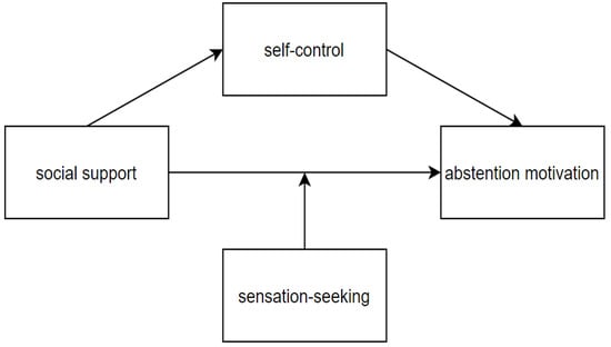 Drug addiction is not only an important health problem but also a serious societal problem worldwide, threatening human health and social development globally. It is closely related to lifespan shortening and the accelerated transmission of sexually transmitted diseases such as HIV [] and is also the antecedent variable of crime []. Finding factors that can facilitate the treatment effect of drug addiction is gaining special attention from scholars and practitioners [,]. Many studies have shown that abstention motivation, defined as a person who can identify the harmful of drug addiction and take measures to give up, is a key factor in the success of drug treatment [,]. Therefore, increasing research has been conducted to find the influencing factors of abstention motivation either from an environmental or personality perspective [,,]. Among environmental factors, social support is a crucial variable [,]. In personal traits, self-control and sensation-seeking are usually used to explain an individual’s abstention motivation or behavior [,].