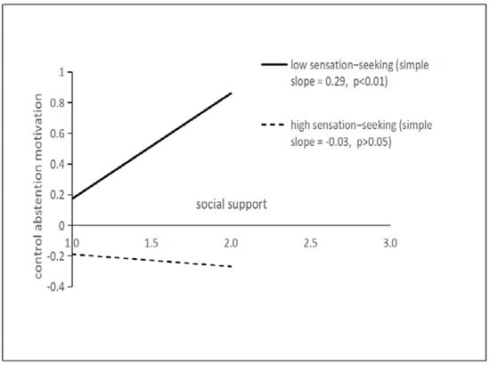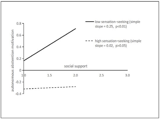The interaction terms of social support and sensation-seeking had significant effects on the autonomous and control abstention motivation. These results indicate that sensation-seeking has a significant moderating effect on the direct influence of social support on autonomous abstention motivation and control abstention motivation. For the above result, Hypothesis 3 was supported.
