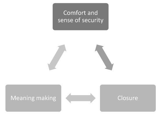 Kübler-Ross and Kessler [44] (p. 155) wrote, “how do we find an ending on a process that encompasses the integration and healing not only of a loss but of a person whom we deeply loved?”. According to them, there are two kinds of closure: one that is expected of the mourner grieving the loss of a loved one—to quickly reach the end of mourning—and second, that requires reflecting on the loss. In the context of the first one, while the mourners are, in subtle ways, asked and expected to quickly attain closure, the bereaved might have different ways of going through the grieving process which may or may not end quickly. In discussing the findings of the study, reflection and introspection become significant to understand the process of initiating closure (without any compulsion to end it).