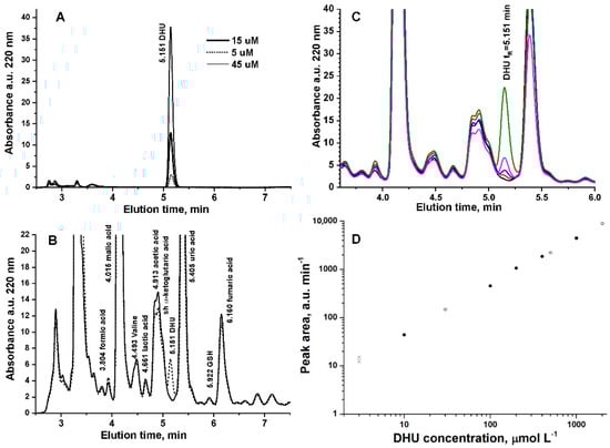 - Svobaite, R.; Solassol, I.; Pinguet, F.; Ivanauskas, L.; Brès, J.; Bressolle, F.M.M. HPLC with UV or mass spectrometric detection for quantifying endogenous uracil and dihydrouracil in human plasma. Clin. Chem. 2008, 54, 1463–1472. [Google Scholar] [CrossRef] [PubMed]