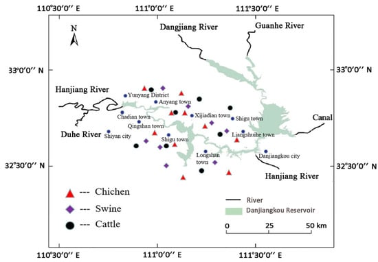 The experimental materials used in this study were all collected from 26 family livestock and poultry farms in 10 villages and towns, such as Xijiadian, Shigu, and Yunyang, in Danjiangkou Reservoir Basin. These family livestock farms, including 8 swine farms, 8 cattle farms (4 beef cattle farms and 4 dairy cattle farms), and 10 chicken farms (5 broiler farms and 5 laying hen farms), have been returning the manure to the field for more than 2 years. In terms of the size of these target family farms, cattle farms ranged from 5 to 15 cattle, the pig amount on hand was 20–50 heads, and chicken farms ranged from 500 to 1500 chickens. The collected samples included livestock manure, breeding wastewater, and manured soil. Among them, there were 42 manure samples (4 beef cow manure, 4 dairy cow manure, 8 sow manure, 8 piglet manure, 8 fattening pig manure, 5 broiler chicken manure, and 5 layer chicken manure), 16 wastewater samples (8 piggery wastewater and 8 cowshed wastewater), and 52 soil samples (26 fertilized soil samples and 26 control soil samples). The manure samples were daily fresh manure, and the wastewater samples were from the raw wastewater pool (as influent) and the outlet of final processing unit (as effluent). Soil samples were the farmland soil with the application of manures, and the control soil was the farmland soil without the application of manures or little human activities. All the samples were frozen and conserved at −20 °C. The details of the distribution of farms in towns and villages along Danjiangkou Reservoir are shown in Figure 1, which was generated using ArcGIS 10.2 software (Esri Inc., Redland, CA, USA).