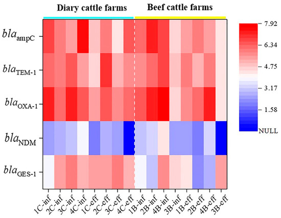 Heat maps of the absolute abundance of bla genes in raw influent (-inf) and final effluent (-eff) from dairy cattle and beef cattle farms.