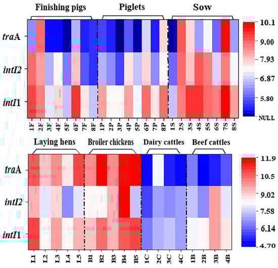 To clarify the occurrence level and distribution pattern of these typical MGEs in family livestock farms, we further analyzed MGEs in manure by real-time qPCR assay. The quantization results showed that the levels of two class integrons were significantly higher than that of conjugated plasmids in the livestock manure on these three types of family farms (Figure 5). Most manure from family swine farms had the highest intI1 gene level, with an abundance ranging from 106 to 1010 copies/g DW, but the abundance of genetic marker traA for conjugative plasmid was about 2~3 orders of magnitude lower than that of intI1, and its abundance level was at 104~108 copies/g DW. The occurrence characteristics of these typical MGEs in family livestock waste were similar to those of large-scale swine manure [48]. Additionally, we found a similar trend in wastewater samples on swine farms; that is, these MGEs in piggery wastewater also showed the distribution pattern of intI1 > intI2 > traA (Figure 6). It is noteworthy that MGEs occur at a higher level in sow manure than that in piglet and finishing swine manure, which may be one of the reasons for the higher level of ARGs in sow manure [14,35]. Unlike MGEs in domestic swine manure, the intI1 and intI2 occurred at the same level in domestic cattle manure, both at 103~109 copies/g DW, but the traA level was at 104~108 copies/g DW. However, the distribution pattern of these MGEs in cattle farm wastewater was basically consistent with that in piggery wastewater, showing the occurrence trend of intI1 > intI2 > traA. Compared with swine farms and cattle farms, MGEs in chicken manure were more common and abundant, especially with the abundance of conjugative plasmids (traA) as high as 108~1011 copies/g DW (Figure 6). This further increased the propagation and dissemination risk of bla genes and improved their contamination level in chicken farm manure, which may be one of the main reasons for the higher abundance of bla genes in family chicken manure.