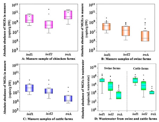 The absolute abundance of MGEs in livestock feces (A–C) and wastewater (D) from family farms. Solid points represent extreme outliers, that is, outliers more than three times the quartile distance; Hollow points represent milder outliers, that is, outliers between 1.5 and 3 quartiles.
