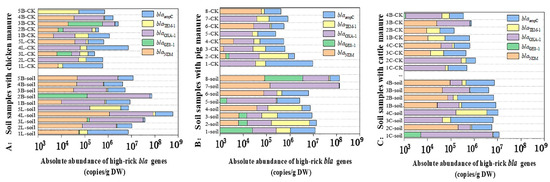 Returning manure to farmland is an important measure to solve manure contamination and realize the planting and breeding cycle. This study also investigated the farmland soil with the long-term application of family livestock manure. The corresponding results revealed that among all the bla genes, the average level of blaampC was the highest in the manured soil, followed by blaOXA-1 and blaTEM-1, which were 1~3 orders of magnitude higher than the control soil (Figure 7). Although the levels of blaNDM and blaGES-1 were low (103~105 copies/g DW) among the tested bla genes, they were widely distributed in farmland soil, with the detection frequencies of 65.3% (34/52) and 26.9% (14/52), respectively. The emergence of blaNDM in farmland soil further increased the ecological and health risks of bla genes because the NDM enzyme encoded by blaNDM can confer bacteria resistant to most β-lactam antibiotics and even other non-beta-lactams [6]. In addition, blaTEM-1 and blaOXA-1 could encode ESBLs, which are the most important enzymes that lead to the resistance of β-lactam antibiotics to clinical pathogens, and ESBLs can hydrolyze not only penicillin but also cephalosporins [51]. Although bla genes in farmland soil were significantly lower than those in livestock manure (about 3~5 orders of magnitude), their abundances were much higher than that in control soil without livestock manure, highlighting their high stability and risks in the soil environment.