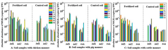 The absolute abundance of MGEs in soil samples applied with livestock manure of family farms.