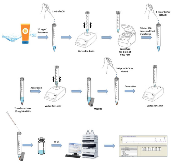 A 2.0 mL portion of the sample solution (environmental and sunscreen) was added to a 15 mL screw-capped, graduated, polypropylene centrifuge tube and buffered with 1.0 mL of phosphate buffer solution (pH 2.5). The solutions were transferred into 20.0 mg of preconditioned SA-MNPs as the adsorbent and vortexed for 1 min. An external magnetic field was used to collect the analyte-rich SA-MNPs, and the supernatant was discarded. Regarding the external magnetic field, Reyes-Gallardo et al. [29] reported that this property is essential in magnetic solid-phase extraction since it allows the easy dispersion of MNPs in aqueous or organic media and their simple recovery by applying a magnetic field, usually in the form of an external magnet. Moreover, according to Lu et al. [30], in biotechnology and biomedicine, magnetic separation can be used as a quick and simple method for the efficient and reliable capture of specific proteins or other biomolecules. Most particles currently used are super paramagnetic, meaning that they can be magnetized with an external magnetic field and immediately dispersed once the magnet is removed. The analyte desorption was performed using 100 μL of ACN as the eluent by vortex for 1 min. The collected solution was diluted two times with DI water, and 20 µL was injected into HPLC.