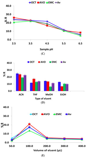Sample pH is considered significant in terms of extraction efficiency and recovery owing to its impact on the affinity of coated nanoparticles with the analyte [31]. pH levels in the range of 2.5–6.5 were evaluated for the recovery of the analytes. This was achieved by using different buffer solutions (phosphate and acetate). At a higher pH, the analytes can be hydrolyzed, leading to a decrease in the extraction efficiency and, hence, low recovery [22,24]. The highest recovery was obtained at pH 2.5 (Figure 2C) and was used for all analyses.