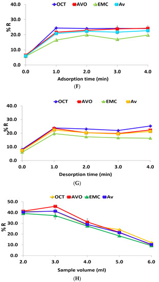 Optimization of the DSPME procedure: (A) Type of sorbent; (B) amount of sorbent; (C) sample pH; (D) type of eluent; (E) volume of eluent; (F) adsorption time; (G) desorption time; and (H) sample volume. Chromatographic conditions: RP-HPLC (Zorbax 4.6 mm ID × 150 mm (5 µm), isocratic elution consisting of 80/20 (%v/v) MeOH:0.5% TFA in DI water, 0.9 mL min−1 flow rate, 40 °C column temperature, and injection volume of 20 µL.