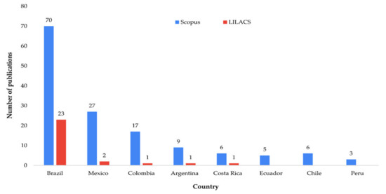 Figure 1 shows the annual variation of publications in both databases. The earliest publications are from 1993. The Scopus database records a higher number of studies per year. Only in one year (2007) were more studies recorded in the LILACS database. An annual average of 7.3 publications are recorded in Scopus and 1.5 in LILACS. The years 2017 and 2021 are the years with the highest number of publications, with 6 in LILACS and 34 in Scopus. Since 2015 there has been a constant growth in the number of publications in the Scopus database.