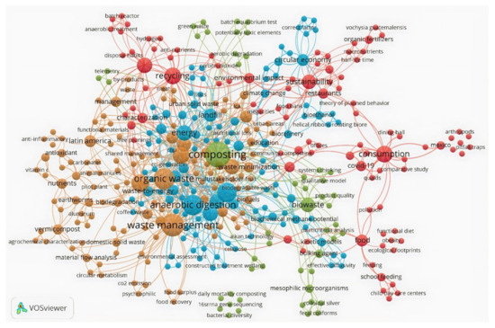 The co-occurrence of keywords network was built using the author’s keywords as criteria. Figure 3 was based on 161 articles retrieved from Scopus; the author’s keywords network was constructed with a total of 379 out of 417 terms (manual edition of the thesaurus list). This figure was assembled in four clusters reflecting the main terms. The resulting network was divided into 4 clusters with 125, 110, 94, and 50 nodes each (379 in total). The nodes with the highest occurrence and link strength were waste management (cluster 1), composting (cluster 2) central node, and the transition point between all the formed clusters along with anaerobic digestion, biogas, and energy (cluster 3), recycling, sustainability, and consumption (cluster 4).