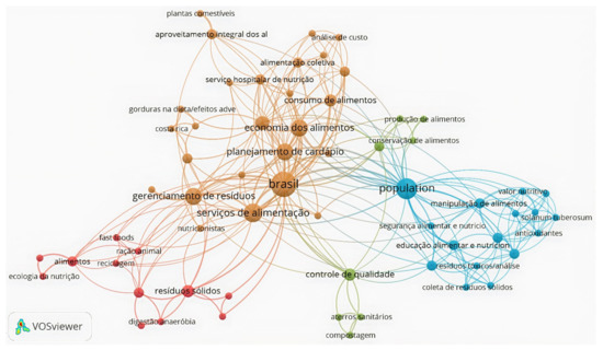 As a complement, the keyword co-occurrence network for LILACS (Figure 4) was divided into four clusters, having 62 nodes in total. LILACS keywords networks were based on 29 articles; the network was built with 62 out of 85 terms. The most frequent terms are food services, Brazil (cluster 1), food handling and solid waste collection (cluster 2), landfill (cluster 3), solid waste, anaerobic digestion, and recycling (cluster 4). All these frequent keywords allowed us to observe that the study of OFMSW in the region is focused on strategies for adequate management, the characteristics, and the source of the waste in the included publications.