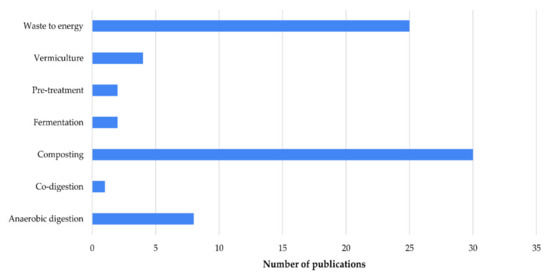 Among the identified techniques and/or processes for treatment and/or valorization of OFMSW, the retrieved literature was classified into different categories: vermiculture, composting, anaerobic digestion, co-digestion, and waste to energy. It was possible to observe the strong preference of the studies for the usage of composting as an alternative for the treatment of OFMSW, having application also in environmental restoration [68], allowing the reduction of the amount of MSW going to landfills, thus avoiding problems of soil contamination or the emission of harmful gases into the atmosphere. Waste to energy approach was also a primary strategy that enhanced the understanding of the potential of energy production should be determined from OFMSW anaerobic digestion and gas incineration from landfills as an alternative for decentralized energy production within the cities.