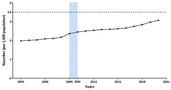 Achieving UHC is a difficult and long-term task that is not unique to China, and many countries are also facing this challenge [6]. It is urgent to strengthen the training of primary health workers due to the insufficient quantity of human resources in primary health-care institutions in China. According to the Outline of the National Medical and Health Service System Plan (2015–2020) [11], China should have had at least 3.5 primary health workers for every 1000 permanent residents by 2020. However, the number of primary health workers per 1000 people in 2020 was only 3.07, based on the Chinese Health Statistics Yearbook 2021, which indicated a shortage of primary health workers. Our study demonstrated that the difference in the growth trend of primary health-care personnel before and after the new medical reform was not considered to be statistically significant.