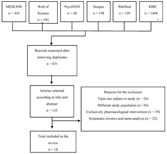 After screening by reading the title and abstract and applying the inclusion and exclusion criteria, a total of 136 articles were obtained, of which 24 were excluded because they did not focus on the object of study, 30 because they did not include people with DS in their sample, 39 because they involved an entirely pharmacological intervention and 25 for being systematic reviews or meta-analyses. Therefore, the final selection consisted of 18 articles. This entire process is detailed in Figure 1.