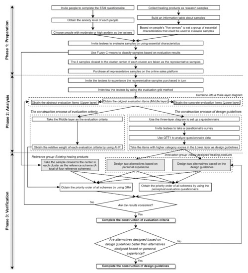 The design strategy for healing products proposed in this study consists of three phases: preparation, analysis, and verification. Based on the research method described in Section 2, the specific implementation steps are as follows and the research process is shown in Figure 1.