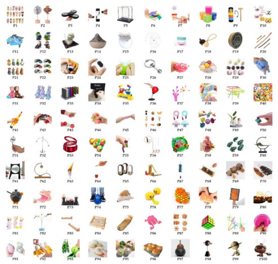 To collect more valid research samples, we consulted psychological counselors and conducted extensive internet research. Finally, 100 healing commodities were selected as research samples, as shown in Figure 2. Subsequently, we constructed an information table to understand and distinguish these samples, as shown in Table 4. The information table includes images, features, and materials of healing commodities.
