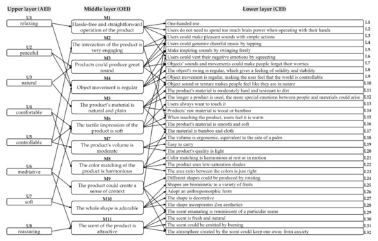 Miryoku Engineering was proposed by Japanese scholar Masato Ujigawa, aiming to design attractive products based on consumer preferences [33]. Attractive refers to the attractive positive factors of a product, which carry users’ needs at all levels of the product. Generally, the attractive factor of a product could be obtained through the evaluation grid method (EGM). EGM is an effective research method of Miryoku Engineering developed by Japanese scholars Junichiro Sanuiand based on the psychology repertory grid method [34]. Specifically, a three-layer diagram of product attractiveness factors could be obtained through EGM. The execution steps of EGM are as follows [35]: First, collect product images or buy the products as stimuli. Second, use stimuli to conduct in-depth interviews with subjects to obtain an individual’s evaluation information. Finally, organize the evaluation information of all subjects to obtain a three-layer diagram, including abstract evaluation items (upper layer), original evaluation items (middle layer), and concrete evaluation items (lower layer). In real-life, EGM has been widely used in design problems such as App Icons [36], online teaching [37], and product form [38]. In this paper, to propose a practical healing product design strategy, we need to use EGM to analyze the attractiveness factors of existing healing products during the analysis phase of the design strategy.