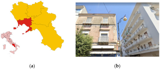 Radon measurements were performed in a private residential flat, on the second floor of a building located in the urban center (Figure 1). The building, constructed in the 1960s, has six floors above ground. On the ground floor there are business premises, while on the other floors there are residential apartments. The building structure, typical of the architectural Italian tradition of the 1950s and 1960s, is made of a load-bearing masonry, in yellow tuff, along the overall perimeter and reinforced concrete frames and pillars in the central area. The foundation is constituted of pillars on isolated plinths and connecting beams, configuring, from a structural point of view, the so-called ‘mixed structure’. The floor is in cement brick, the internal walls are made of clay bricks.