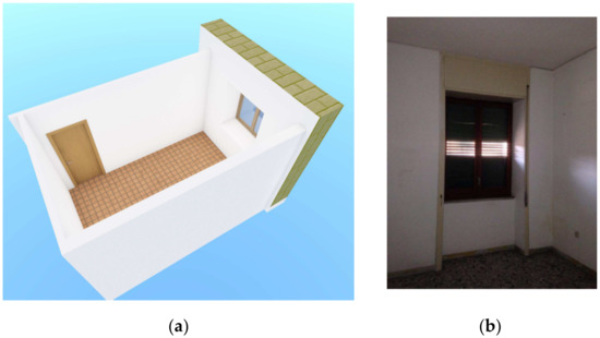 Figure 2 shows the structural features (typology) of the test room, of about 38 m3, with evidence of the different materials delimiting the room volume and the presence of a window, of about 1.8 m2, assuring natural ventilation. There are no heating, cooling, or ventilation systems in the room.