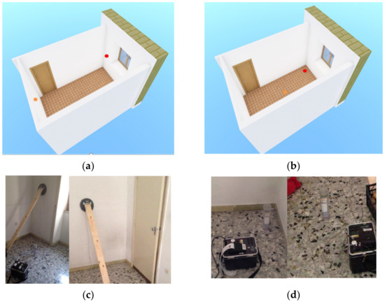 3D drawing with evidence on the localization of the instrument (red dot) for measurements on (a) walls and (b) indoor air. Set up of the instrument: wall (c) and indoor air (d) measurements.
