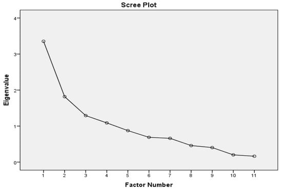 Sample adequacy (n = 105) confirmed by KMO measure was found to be 0.81, and it was considered meritorious [34,35], and BTS confirmed (Chi-Square = 386.162; p < 0.001) that the 11-item model was fit to run principal component analysis (PCA). Based on eigenvalue > 1 and scree plot (Figure 1), the four-factor model fits better to explain the data under the 11-item model with cumulative variance of 68.645% (Table 4), which was considered acceptable [38]. Factor loading for each item of the Arabic translated version of the 11-item Ar-KOOS-PF-F was tabulated in Table 5. It was evident that the minimum factor loading for the item was 0.352 and the highest was 0.811. As the factor-loading ranges between 0.352 and 0.811, it lies within the permissible limit to confirm factorial validity [33]. Overall, item communalities vary from 0.529 for the seventh item to 0.867 for the ninth item in Table 6, which yields moderate to high communalities [31,33]. Thus, the homogeneity of the Ar-KOOS-PF-F was determined using PCA.