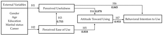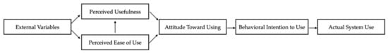 In order to study how individuals’ attitudes affect their behavior consciously, Ajzen and Fishbein [] proposed the theory of reasoned action (TRA). Although this theory has been widely used by experts and scholars in many fields to explore the relationship among individuals’ attitudes, subjective norms, and behavioral intentions, it is still unable to effectively explain the behavior of individuals in the field of information technology []. Therefore, the technology acceptance model (TAM) (as shown in Figure 1) was proposed based on TRA to explore the influence of external variables on individuals’ beliefs, attitudes, and intentions. By understanding the degree of users’ usage intentions in using information technology and the degree of influencing willingness, the model can predict whether behavioral intention affects an individual’s information technology use behavior [,,]. Many researches have used the TAM model to explore users of health information systems [,]. Some research added externalities (gender, age, experience, etc.) as adjustment factors and thus were able to predict more than 70% of users’ intentions [].