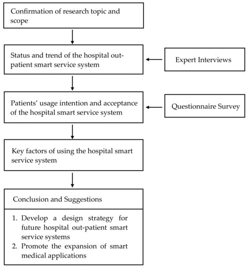 Therefore, this study intended to use the technology acceptance model (TAM), with a questionnaire survey and expert interviews as the main research methods, to analyze patients’ perceptions of and attitudes toward the hospital smart service system, as well as explore patients’ usage intention and acceptance, in order to facilitate the subsequent identification of the influencing factors of patients’ use of smart service systems for medical treatment. Based on the research topic and purpose, this study outlines its research structure and steps. First, the research direction was proposed according to the research topic. Secondly, the patients’ attitudes and willingness to use the hospital smart service system were analyzed using TAM. Finally, the research scope and main research subjects were defined, and the design strategy of the hospital smart service system was discussed through expert interviews and questionnaire surveys. The research was carried out in three stages, as shown in Figure 2.
