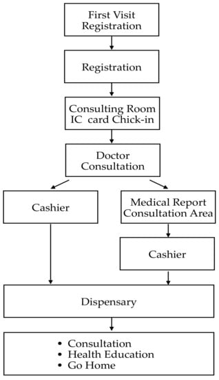 In the outpatient process, the first step is to make an appointment. The patient can choose an online appointment, a telephone appointment, or an on-site appointment. Then, the patient checks in at the clinic by inserting the NHI card and waits in the waiting area for their appointment. When it is their turn, the patient will be called by voice with their name being shown on the display near the consulting room. After the diagnosis and treatment by the doctor, if there is no need for any further examination, the doctor will ask the patient to go directly to the cashier counter to pay the fees. If a follow-up examination is required, the fees will be paid after the examination. The patient can freely choose to pay at the counter or use the self-payment kiosk to pay the fees. Finally, the patient can go to the pharmacy to get the medicine or participate in consultation and health education courses. The specific flow chart is shown in Figure 3.