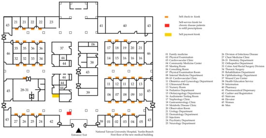 In the spatial layout of NTUH Yunlin Branch, after a person enters from the gate, they will see the cashier and registration counter on the left. Two self-payment kiosks are located opposite the cashier and registration counter. There are also two self-service kiosks for refilling prescriptions near the exit of the hospital, and one self-check-in kiosk is located outside each department. The specific plan of the hospital is shown in Figure 4.