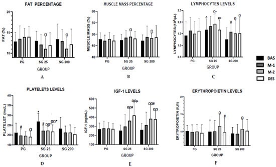 Key values: (A) fat percentage in the different evaluations; (B) muscle mass percentage in the evaluations; (C) lymphocytes levels in the different evaluations; (D) platelet levels evolution during the experimental period; (E) IGF-1 levels in the different evaluations; (F) erythropoietin levels in the different evaluations; SG 25: 25 mg group; SG 200: 200 mg group; BAS: baseline; M-1: month 1; M-2: month 2; DES: desadaptation; # p < 0.05 differences with respect to previous evaluation (paired samples Wilcoxon test); µ p < 0.05 differences desadaptation vs. month 1 (paired samples Wilcoxon test); Ω p < 0.05 desadaptation or month 2 vs. baseline (paired samples Wilcoxon test); Ω Ω p < 0.01 mismatch or month 2 vs. baseline (paired samples Wilcoxon test); * p < 0.05 differences placebo vs. SG 25 or SG 200 (Mann–Whitney U test; ^ p < 0.05 differences SG 25 vs. SG 200 (Mann–Whitney U test).