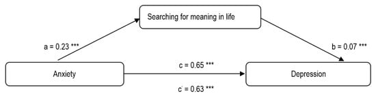 Results of mediation analysis of searching for meaning in life in the relationship between anxiety and depression. *** p < 0.001.