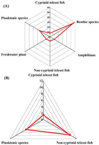 The 121 ATVs contained a high proportion of vertebrate species (61.16%), including cyprinid teleost fishes, non-cyprinid teleost fishes, and amphibians. The percentage of invertebrate species was 37.71%, including the planktonic species and benthic species, while the percentage of freshwater plants was 0.82% for ATVs of silver. The geometric mean of the SMAVs to silver in increasing order evidenced that: cyprinid teleost fishes < non-cyprinid teleost fishes < amphibians < freshwater plants < planktonic species < benthic species, for various taxonomic groups of freshwater aquatic organisms (Figure 1A). Meanwhile, the 15 CTVs included cyprinid teleost fishes (20.00%), non-cyprinid teleost fishes (26.67%), and planktonic species (53.33%). The geometric mean of the SMCVs to silver in increasing order evidenced that: cyprinid teleost fishes < planktonic species < non-cyprinid teleost fishes, for various taxonomic groups of freshwater aquatic organisms (Figure 1B). Overall, the cyprinid teleost fishes showed the most sensitivity to silver under both short-term and long-term exposure based on the SMAVs and SMCVs.