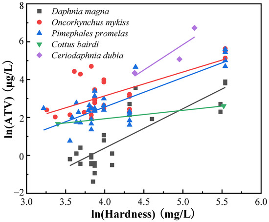 The relationship between the water quality characteristics and the toxicity should be taken into account using an analysis of covariance when enough data are available to prove the relationship between two or more species [24,25]. The hardness adjustment was used as an analysis of covariance to estimate the effect of hardness in tested waters on the acute toxicity to silver of freshwater aquatic organisms. In order to enhance the reliability of the toxicity data, the ATVs for a species should cover a broad enough range of the water hardness that the highest hardness is at least three times the lowest, and at least 90 mg/L higher than the lowest hardness calculated with CaCO3.