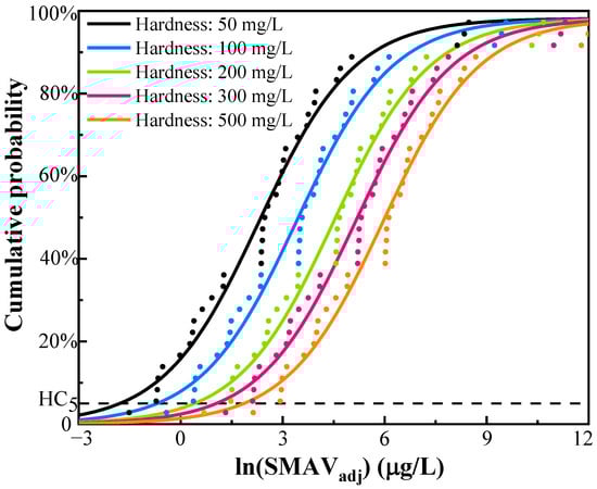 The ATVs of silver for freshwater aquatic organisms were adjusted to the approximate water hardness in China using a Kpooled value of 1.58. The water area proportion of water hardness distribution to total surface water area was 42%, 34%, 11%, and 13% for hardnesses of <150 mg/L, 150–300 mg/L, 300–450 mg/L, and >450 mg/L, respectively, in China according to the results of the third China National Surface Water Quality Evaluation [28]. Based on the principle of the equal distribution of data, the ATVs were adjusted to five hardness levels by the hardness correction equation (Equation (1)) with the Kpooled. After hardness adjustment, the ranked SMAVsadj ranged from 0.66 μg/L to 14,400.63 μg/L with a hardness of 100 mg/L as CaCO3 (Table 1).