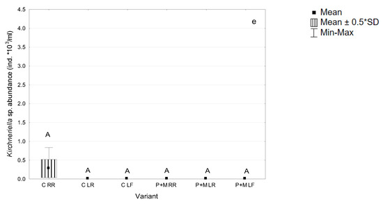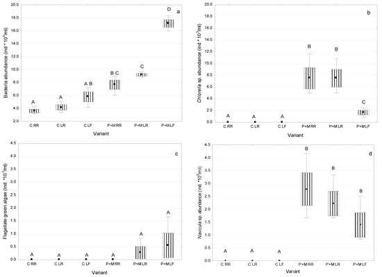 The obtained results revealed that after the 9-day incubation period, different microorganisms developed in the experimental controls and variants containing S. polyrhiza (Figure 1). Bacteria occurred in all controls and variants with plants (Figure 1a), whereas green algae (except for Kirchneriella sp.) and diatoms were found only in the variants with the duckweed (Figure 1b–e). The estimated abundance of bacterial cells was lower in the controls than in the variants with plants (Figure 1a). The abundance of bacterial cells reached the lowest values in the controls with MC-RR (3.6 × 106 ind./mL) and had almost five-fold higher values (17.1 × 106 ind./mL) in the variants with the duckweed and MC-LF. In all controls, the abundance of bacterial cells was similar, and no statistically significant differences were found. However, in general, significant differences (p < 0.05) in abundance were found among the controls and variants with macrophytes. The statistically significant difference in abundance of bacterial cells was also found between the variants with S. polyrhiza and MC-RR and MC-LR, and S. polyrhiza and MC-LF (Figure 1b). Chlorella sp., flagellate green algae, and Navicula sp. (diatoms) were found only in variants with the duckweed, whereas Kirchneriella sp. was present in one control containing MC-RR (Figure 1b–e). In general, the abundance of these eukaryotes was between 1000 and 10,000 times lower than the abundance of bacterial cells. Chlorella sp. was the most abundant among eukaryotic microorganisms, and reached up to 7.5 × 103 ind./mL (Figure 1b). The statistically significant differences in the abundance of Chlorella sp. were found between all controls and variants with S. polyrhiza, and between the variants with S. polyrhiza and microcystins RR and LR and S. polyrhiza and MC-LF. In the last variant containing MC-LF, the abundance of Chlorella sp. was the lowest (1.91 × 103 ind./mL). The abundance of flagellate green algae (0.28–0.56 × 103 ind./mL) found in the variants with S. polyrhiza and MC-LR and MC-LF (Figure 1c) was a few times lower than the abundance of Navicula sp. (Figure 1d), and it was similar to the abundance of Kirchneriella sp. (Figure 1e). The abundance of Navicula sp. was the lowest in the variants with MC-LF and the highest in the variants with MC-RR. However, the differences were not statistically significant (Figure 1d).