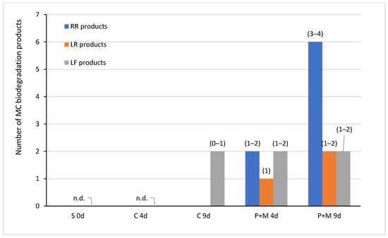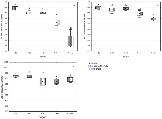 The study showed that MCs’ concentrations decreased after the incubation with S. polyrhiza and associated microorganisms (Figure 2), and the degradation rate was different for MC-RR, MC-LR, and MC-LF (Table 1). The highest statistically significant decrease in MC concentration (Figure 2) and the highest degradation rate (Table 1) were observed for MC-RR (followed by MC-LR) after nine days of their incubation with S. polyrhiza and associated microorganisms. For instance, after nine days, the MC-RR concentration decreased by 61% in comparison with the beginning concentration, and it was equal to 384.3 ng/mL (Table 1, Figure 1a). The degradation rate of MC-LR after nine days of incubation was 21% (Table 1), and the MC-LR concentration decreased to 886.0 ng/mL (Figure 1b). The average MC-LF concentration decreased from 850 ng/mL at the beginning of the experiment to 786.7 ng/mL at the experimental endpoint (Figure 1c); however, the changes observed were not statistically significant. There were no statistically significant differences among concentrations of particular MCs in the controls both after four and nine days of experiments.