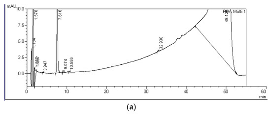 The HPLC-photodiode array detection system (Shimadzu, Kyoto, Japan) was used for the detection and identification of MCs and their degradation products. The UV detection range was 200–300 nm. MC-RR, MC-LR, and MC-LF (Enzo Life Science, Lausen, Switzerland) were used as the standards. Separation of supernatant components was performed using a Purosphere column (125 × 3 mm, dp 5 µm, Merck, Darmstadt, Germany) with the mobile phase composed of acetonitrile (Merck, Burlington, VT, USA) and gradient-grade water for HPLC acidified with 0.05% trifluoroacetic acid (gradient 30–100%), at a flow rate 0.7 mL/min. MCs and their biodegradation products were identified on the basis of specific spectra and the time of elution compared with the spectra and elution times of standards. Each fresh MC standard used in the experiment, to prepare a calibration curve, and to identify MCs and their degradation products had one specific peak and spectrum.