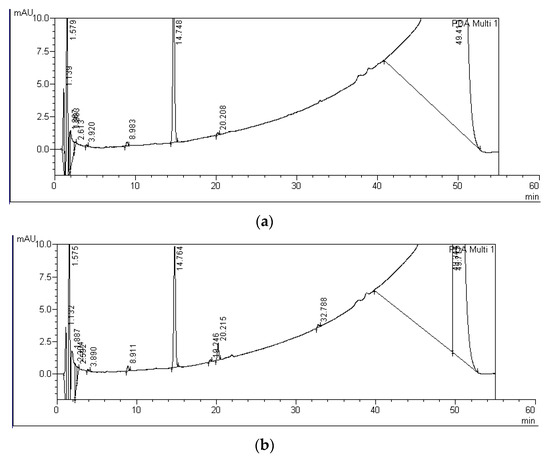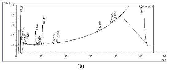 HPLC chromatograms indicating the progressive reduction peaks relevant to MC-LR and growing peaks of MC-LR degradation products after four (a) and nine days (b) of incubation with S. polyrhiza and associated microorganisms. Peaks and their retention times for MC-LR and its degradation products were as follows: MC-LR—14.748–14.764 min.; A-LR—19.246 min. and B-LR—20.215–20.208 min.