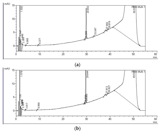 HPLC chromatograms indicating the peaks of MC-LF and its degradation product after four (a) and nine days (b) of incubation with S. polyrhiza and associated microorganisms. Peaks and their retention times for MC-LF and its degradation product were as follows: A-LF—28.938–29.088 min. and MC-LF—29.644–29.802 min.