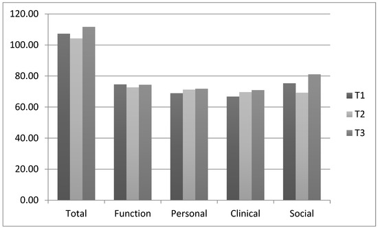 As shown in Figure 1, both mean total and social RAS-DS scores decreased between T1 and T2 before increasing again at T3. The sample mean total and personal recovery scores increased by 4% over the course of the study, while higher increases were identified for clinical recovery (6%) and social recovery (8%).