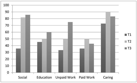 The proportion of consumers rating their social participation as ‘about right’ increased by 46% between T1 and T2, with smaller increases reported for caring participation (17%) and work participation (17%). A further 25% of consumers rated their participation in unpaid work as ‘about right’ at T3; however, (as shown below in Figure 2) perceptions of participation in all other activities categories remained steady.