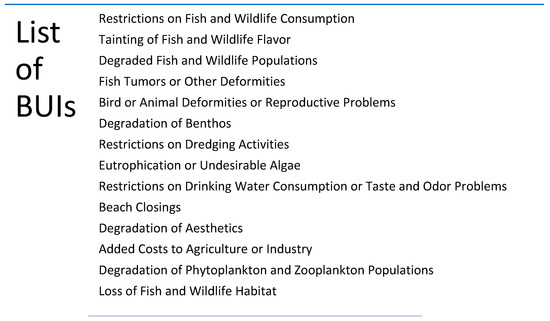The OneHealth approach recognizes the importance of interconnections between human health and the environment [1,2,3]. An exemplary international effort of this nature is the long-standing U.S.-Canada Great Lakes Water Quality Agreement (GLWQA), which aims to restore and protect roughly 21% of the global surface freshwater supply. Since its inception in 1972, the U.S.-Canada GLWQA has set forth the bi-national environmental and scientific goals to protect and restore the Laurentian Great Lakes (hereafter, Great Lakes). Through the Area of Concern (AOC) program under the auspices of the GLWQA, federal, provincial, state, tribal, and first nation partner agencies in the United States and Canada have laid the groundwork for identifying, remediating, and restoring degraded areas and putting them on the path to revitalization by communities [4,5]. The GLWQA identifies AOCs as “geographic areas that fail to meet the general or specific objectives of the agreement where such failure has caused or is likely to cause impairment of beneficial use of the area’s ability to support aquatic life.” [6]. When the program was initiated in 1987, 43 AOCs were identified, 31 of which were entirely or partly in U.S. waters. Most AOCs are located near population centers, are within the Great Lakes coastal zone, and are degraded by legacy contaminants including heavy metals and persistent organic pollutants [7]. The program recognizes 14 distinct beneficial use impairments (BUIs; Figure 1). In brief, a beneficial use impairment is any change (chemical, physical, or biological) to an area which causes significant environmental degradation. Nearly all AOCs have multiple impaired beneficial uses, which arise from multiple causes including sediment and water contamination, habitat loss, excess nutrients and sediment inputs, and improperly functioning storm or sewer systems [8]. The AOC program’s goal is to remove BUIs through contaminated sediment remediation, aquatic habitat restoration, or both. To delist an AOC, delisting targets and corresponding management actions such as specific remediation or restoration projects are established by local advisory groups through a remedial action plan (RAP) [9]. The AOC program is among the largest environment clean-up programs in the world, having spent nearly $23 Billion US dollars between 1985 and 2019 [4]. Ecological restoration efforts within AOCs have been associated with increased ecosystem services [10] and social benefits [11], including increased property values, recreation, and waterfront development [7,12,13], as well as the potential for improved human health and wellbeing [14].