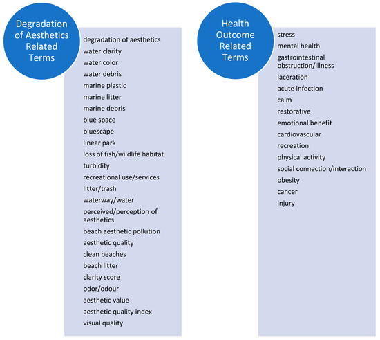 To identify key search terms relevant to degradation of aesthetics and human health impacts, we identified keywords from both aesthetics and loss of habitat literature. The aesthetics literature yielded terms related to water quality such as turbidity, water color, and odor, whereas the loss of habitat literature yielded terms related to recreational use and services. We also examined literature that theorized connections between aesthetic degradation or loss of habitat with human health for possible health outcome-related terms. These studies used terms such as aesthetic value, visual quality, or an aesthetic quality index to capture psychological perceptions of natural spaces. The psychological terminology throughout the literature also yielded terms describing health-outcomes, including depression, anxiety, and other mood disorders. We combined these literature-specific efforts to develop an encompassing list of relevant search terms (Figure 2) for both exposures and outcomes related to degradation of aesthetics. We conducted literature searches through 31 July 2021 with the Environmental Protection Agency’s (EPA)s Health & Environmental Research Online (HERO) librarians within PubMed and Web of Science databases to identify relevant articles.