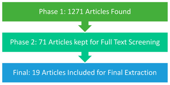 After title and abstract screening arbitration, a total of 68 articles were included for full text screening. Three additional studies were added for full text screening from author knowledge. Each of these articles was screened by two reviewers with the same criteria used for title and abstract screening. Again, if any conflicts occurred in screening, all reviewers met to reconcile based on consensus. After arbitration, a total of 19 articles were included for final review and data extraction (Figure 3).
